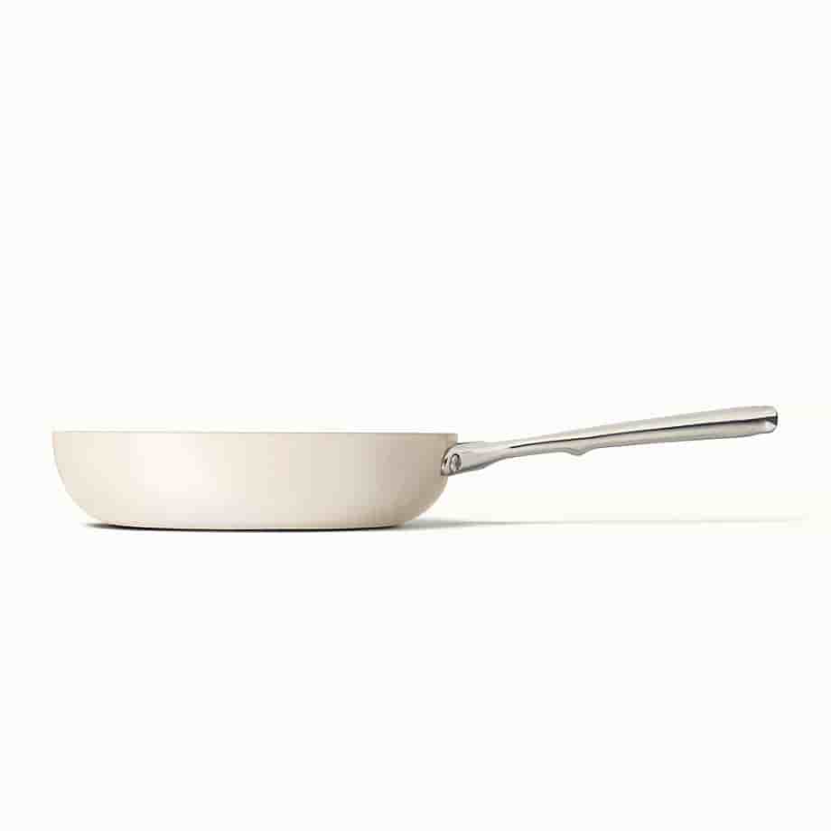 Featuring a minimalist design with a creamy exterior and gold handle, the skillet is made just for us. The ceramic coating provides superior non-stick performance for excellent results.